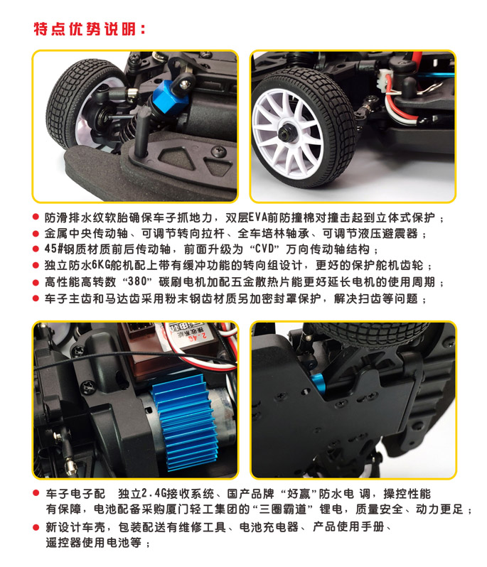 “酷迈”这是一款车辆模型高级比赛用车,速度与激情并存,适合有一定基础的赛车模型运动选手使用。产品采用轴传4轮驱动、可调节转向拉杆、全车培林轴承、粉末钢齿、可调节的液压避震器,CVD金属万向节传动轴,高转速380碳刷电机搭配锂电动力等设计亮点。这是一款有助于学生在比赛中出成绩的赛车,通过比赛,帮助孩子学习赛车文化,提升自我。