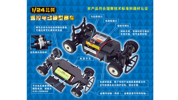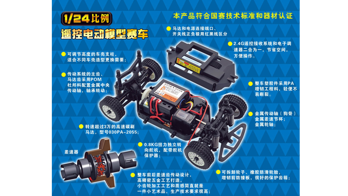 “战旗”设计定位于车辆模型初级学习阶段,适合刚接触车辆模型运动项目的中小学生和科技老师教学使用。产品采用2.4G遥控控制系统,轴传4轮驱动,前后差速结构,培林轴承传动结构,比例转向等设计科技。通过动手操控和维修调试,有助于孩子了解机械和电子动力基本原理,帮助孩子了解简单的车子构造,齿轮传动和材料性能等科学知识。