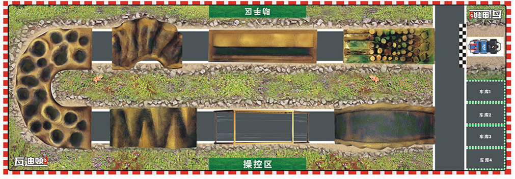场地平整地面上布置约3.5*1.2米障碍场景,“∩”型路线,6~ 8个场景。每一场景设1-2个障碍任务点,除场景4和场景8为固定位置,