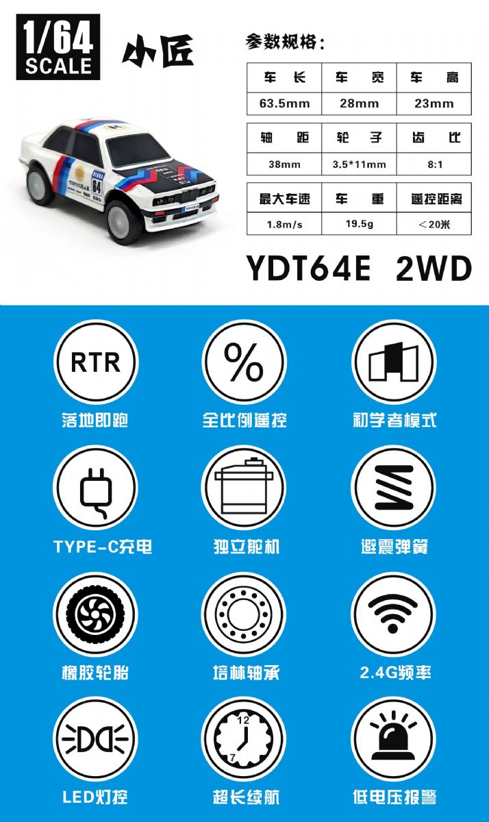 LED灯光系统:通过2.4G遥控器第三通道控制前大灯、双闪、关闭三种模式并带有转向灯、低电量双闪提示功能。遥控器自带TYPE-C充电功能。